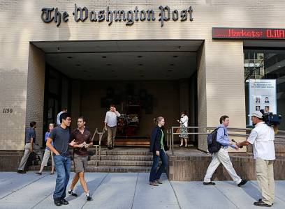 People walk by the entrance of the Washington Post headquarters in Washington
