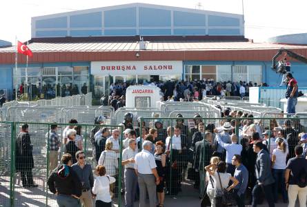Lawyers and media members wait to enter a courthouse in Silivri
