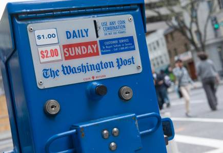 Washington Post and Washington Times newspaper boxes are pictured outside the entrance to the Washington Post headquarters in Washington