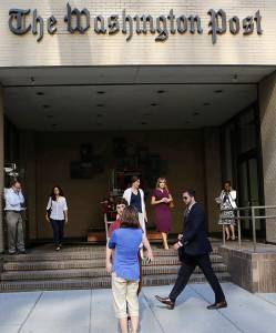 People walk by the entrance of the Washington Post headquarters in Washington, August 5, 2013. Amazon Inc founder Jeff Bezos has agreed to buy the newspaper assets of the Washington Post Co, including its flagship daily, for $250 million. REUTERS/Stelios Varias (UNITED STATES - Tags: MEDIA BUSINESS)