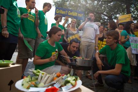 Green party members watch members of FDP youth wing have barbeque in front of the Green Party headquarters in protest of proposed vegetarian day in Berlin