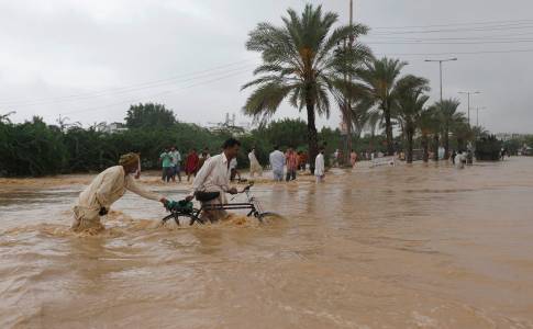Men push their bicycles through flood waters on the outskirts of Karachi