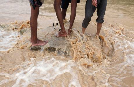 Barefooted men take break on a road median while wading through flood waters on the outskirts of Karachi