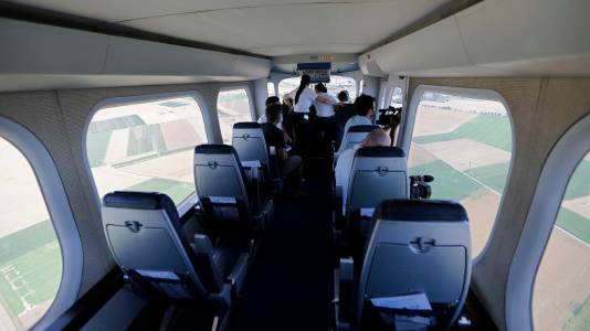 Passengers sit in the cabin of a helium-filled Zeppelin NT during a media trip from an airport outside Cergy-Pointoise