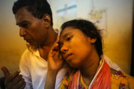 A relative helps Rabeya (R), a garment worker, to admit into Dhaka Medical College hospital after she got injured during a protest in Dhaka August 4, 2013. According to local media, hundreds of garment workers, mainly women, took to the streets on Sunday demanding for their salaries and bonuses before Eid al-fitr that they claimed their employers have failed to pay. REUTERS/Andrew Biraj (BANGLADESH - Tags: BUSINESS CIVIL UNREST EMPLOYMENT RELIGION)