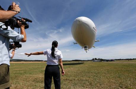 A ground crew member maintains a safety perimeter as a semi-rigid and helium-filled Zeppelin NT lands in a field at an airport outside Cergy-Pointoise