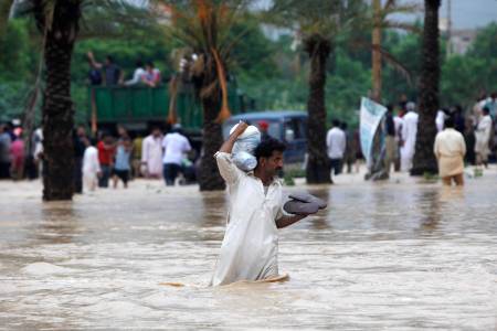 A man carries his belongings on his shoulder while wading through flood waters on the outskirts of Karachi