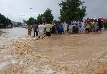 Residents wait to cross a flooded road on the outskirts of Karachi August 4, 2013. At least a dozen people were killed in accidents caused by torrential rain which hit different parts of the port city of Karachi on Saturday, according to local media. REUTERS/Akhtar Soomro (PAKISTAN - Tags: DISASTER ENVIRONMENT)