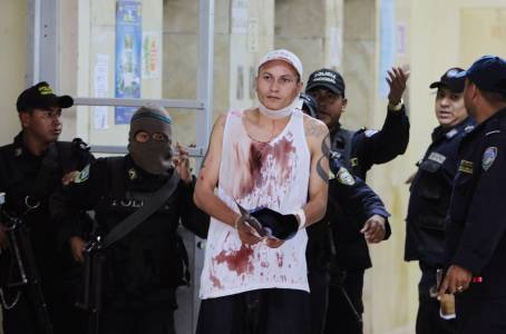 An injured gang member is escorted by policemen after being checked by doctors at a hospital in Tegucigalpa