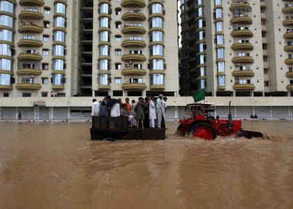 A tractor tows residents through flood waters to a safe place on the outskirts of Karachi