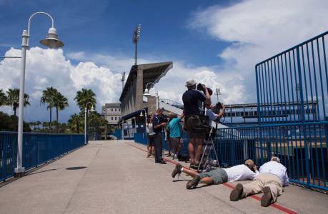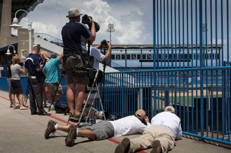 Members of the media line fences of George M. Steinbrenner Field while waiting for New York Yankees' Rodriguez to participate in a simulated baseball game in Tampa