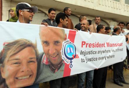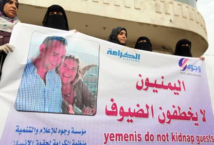 Journalists and human rights activists hold a banner during a protest to demand the release of journalist Judith Spiegel and her partner Boudewijn Berendsen, the Dutch couple who have been kidnapped in Yemen, outside the home of Yemeni President Abd-Rabbu Mansour Hadi in Sanaa August 1, 2013. REUTERS/Mohamed al-Sayaghi (YEMEN - Tags: CRIME LAW CIVIL UNREST POLITICS MEDIA)
