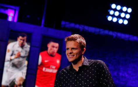 Football expert James waits for his cue during the BT Sport channel launch program at the BT Sport studio in the Queen Elizabeth Olympic Park, in east London