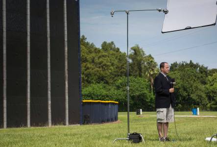Television reporter stands outside New York Yankees minor league complex while waiting for Yankees' Rodriguez to appear during a rehab assignment in Tampa