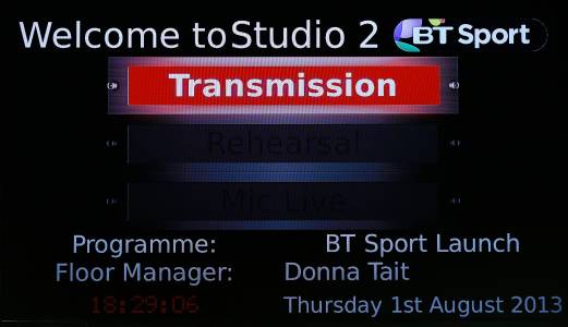 A screen showing that BT Sport channel launch program is on air is seen outside the BT Sport studio in the Queen Elizabeth Olympic Park, in east London August 1, 2013. Britain's BT launched its much heralded sports TV service today in the biggest challenge to the dominance of BSkyB since Rupert Murdoch launched the pay-TV group over 20 years ago. REUTERS/Suzanne Plunkett (BRITAIN - Tags: MEDIA SPORT BUSINESS)