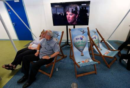 Studio audience members wait near a screen showing BT Sport presenter Clare Balding at the BT Sport studio in the Queen Elizabeth Olympic Park, in east London, August 1, 2013. Britain's BT launched its much heralded sports TV service on Thursday in the biggest challenge to the dominance of BSkyB since Rupert Murdoch launched the pay-TV group over 20 years ago. REUTERS/Suzanne Plunkett (BRITAIN - Tags: ENTERTAINMENT MEDIA BUSINESS SPORT)