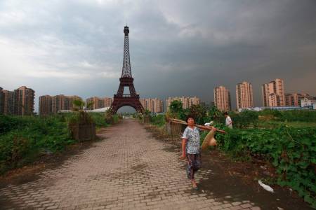 A farmer walks down a dirt road under a replica of the Eiffel Tower at the Tianducheng development in Hangzhou, Zhejiang Province August 1, 2013. Tianducheng, developed by Zhejiang Guangsha Co. Ltd., started constructing in 2007 and was known as a knockoff of Paris with a scaled-replica of the Eiffel Tower, standing 108 metres, and Parisian houses. Although designed to accommodate at least ten thousand people, Tianducheng remains sparsely populated and is now considered as a "ghost town", according to local media. REUTERS/Aly Song (CHINA - Tags: SOCIETY ENVIRONMENT BUSINESS REAL ESTATE)