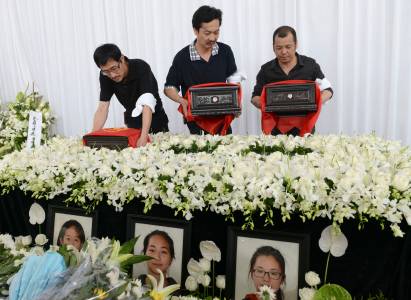 The fathers of Liu Yipeng, Wang Linjia and Ye Mengyuan, the three girls who died in the Asiana Airlines crash, carry the ashes of their daughters during a memorial in Jiangshan