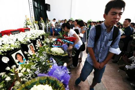 People pay their respects during a memorial for Liu Yipeng, Wang Linjia and Ye Mengyuan, the three victims of an Asiana Airlines crash, in Jiangshan