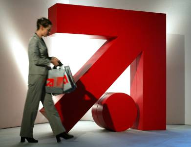 File photo of a woman walking by a large logo of ProSiebenSat.1 Media
