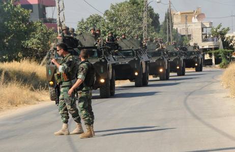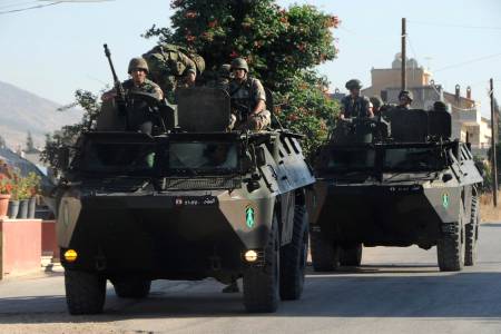 Lebanese Army soldiers on their armoured carriers in the town of Majdal Anjar