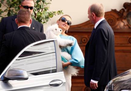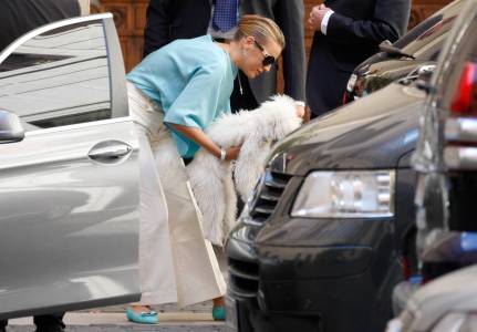 Berlusconi's girlfriend Pascale holds a dog at Grazioli palace in downtown Rome