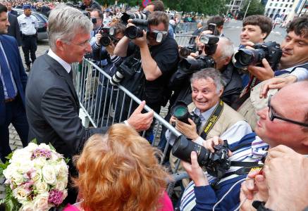 Belgium's King Philippe greets a group of press photographers, including Charlier, after a mass commemorating the 20th anniversary of King Baudouin's death at Saint Gudule cathedral in Brussels