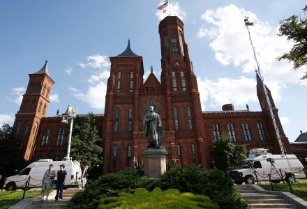 Live news television vans are parked alongside a statue of Joseph Henry, the first secretary of the Smithsonian Institution, after it was vandalised with green paint, outside the institution's Washington headquarters, July 29, 2013. Three landmarks in Washington -- the Lincoln Memorial, the National Cathedral and the Henry statue, were vandalized with paint in recent days. Local media quoting Washington police said a woman has been arrested but investigations are still ongoing on whether the cases are linked. REUTERS/Jason Reed (UNITED STATES - Tags: POLITICS CRIME LAW TRAVEL MEDIA)