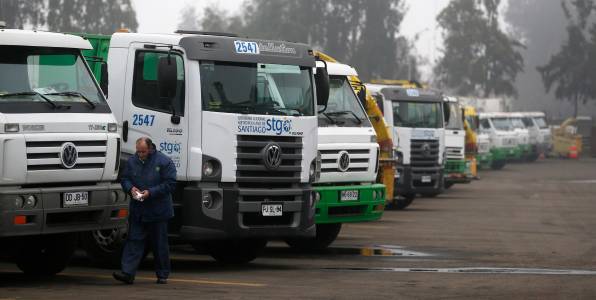 A garbage collector walks past garbage trucks parked during a national strike at Santiago, July 29, 2013. Garbage collectors have begun a national strike on Monday demanding improvements in their salaries, according to media reports. REUTERS/Ivan Alvarado (CHILE - Tags: POLITICS CIVIL UNREST BUSINESS EMPLOYMENT)