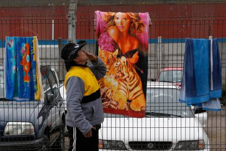 A garbage collector blows a kiss towards an image on a towel as he attends a national strike at Santiago, July 29, 2013. Garbage collectors have begun a national strike on Monday demanding improvements in their salaries, according to media reports. REUTERS/Ivan Alvarado (CHILE - Tags: POLITICS CIVIL UNREST BUSINESS EMPLOYMENT SOCIETY)