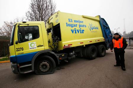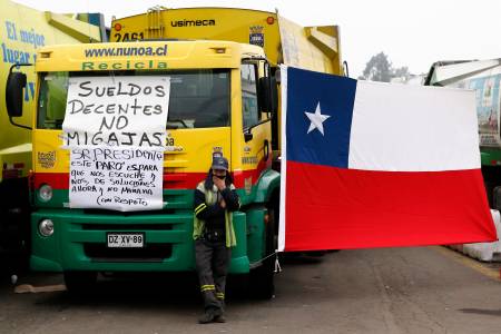 A garbage truck blocks a main gate of a waste transfer station during a national strike at Santiago