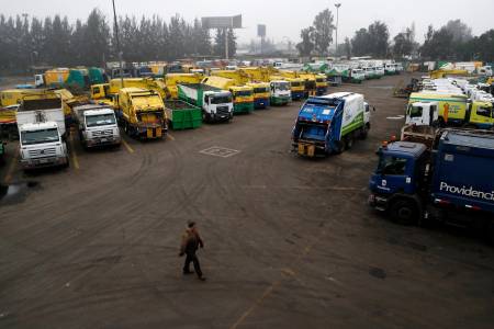 A garbage collector walks past garbage trucks parked during a national strike at Santiago
