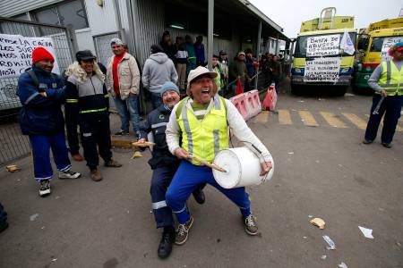 Garbage collectors joke as they attend a national strike at Santiago, July 29, 2013. Garbage collectors have begun a national strike on Monday demanding improvements in their salaries, according to media reports. REUTERS/Ivan Alvarado (CHILE - Tags: POLITICS CIVIL UNREST BUSINESS EMPLOYMENT)