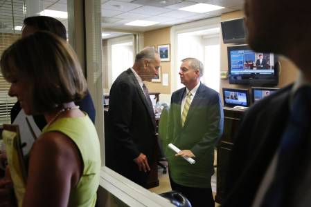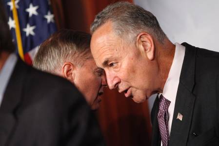 Schumer and Graham confer before a news conference to push new bipartisan media shield legislation at the U.S. Capitol in Washington