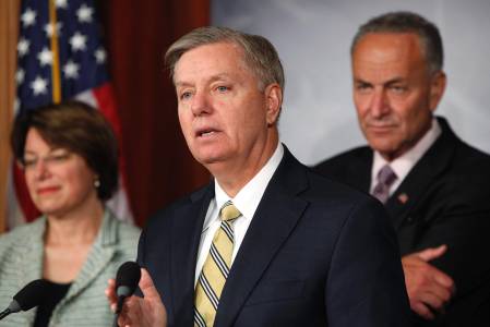 U.S. Senator Graham and Senator Schumer speak during push for new bipartisan media shield legislation during news conference at U.S. Capitol in Washington