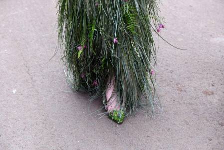 A women wearing a dress of fresh flowers designed by Zita Elze walks around the grounds on media day at the Chelsea Flower Show in London