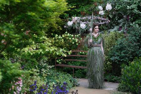 A women wearing a dress of fresh flowers designed by Zita Elze poses for photographers in the M & A Centenary Garden during media day at the Chelsea Flower Show in London