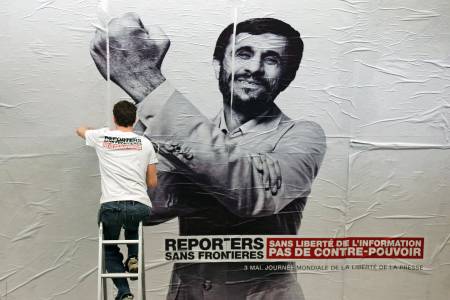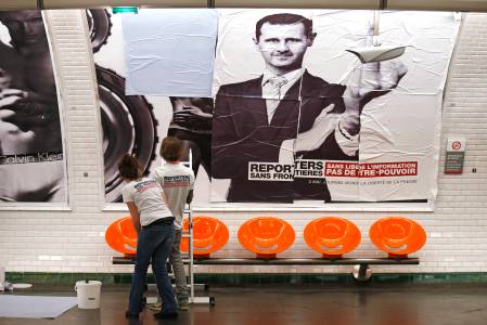 Activists from Reporters Without Borders (RSF) paste a poster to mark the 20th annual World Press Freedom day in the Opera Metro (subway) station in Paris May 3, 2013. REUTERS/Benoit Tessier (FRANCE - Tags: POLITICS CIVIL UNREST MEDIA) TEMPLATE OUT