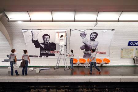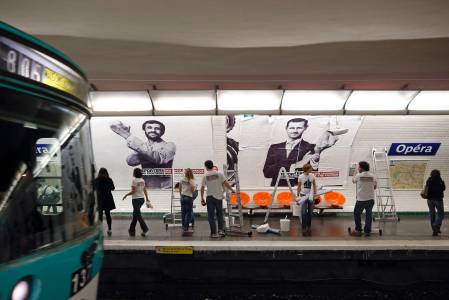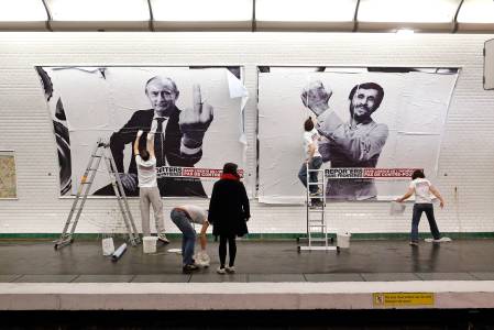 Activists from Reporters Without Borders (RSF) paste a poster to mark the 20th annual World Press Freedom day in the Opera Metro (subway) station in Paris
