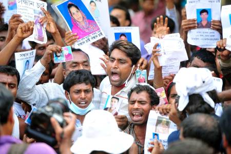 Relatives show pictures of garment workers, who are missing after the collapse of the Rana Plaza building, as they react to media in Savar, outside Dhaka May 2, 2013. The mayor of the Bangladesh municipality where a factory building collapsed killing more than 400 people was suspended from office on Thursday, a government minister said, as rescuers pressed on with the task of recovering bodies from the wreckage. REUTERS/Khurshed Rinku (BANGLADESH - Tags: DISASTER)