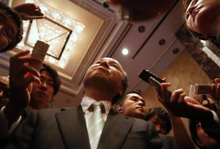 Softbank Corp President Masayoshi Son is surrounded by media at a news conference in Tokyo