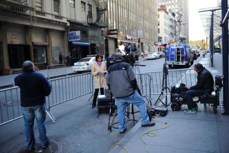 Members of the media broadcast a report as New York City Police officers guard a door in front of 51 Park Place, where a piece of airplane landing gear was discovered, in New York, April 27, 2013. A piece of landing gear believed to be from one of the commercial airplanes that crashed into the World Trade Center on September 11, 2001, has been discovered, wedged between two lower Manhattan buildings, police said on Friday. REUTERS/Keith Bedford (UNITED STATES - Tags: TRANSPORT DISASTER)