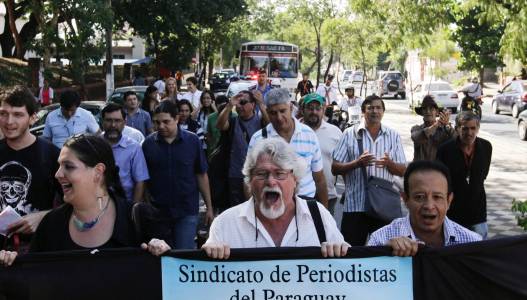 Journalists demonstrate on Paraguayan Journalist Day to demand justice for the death of journalist Carlos Manuel Arza, in Asuncion April 26, 2013. Arza was killed on April 25 in Pedro Juan Caballero, 547 km (340 miles) northeast of Asuncion. REUTERS/Jorge Adorno (PARAGUAY - Tags: CIVIL UNREST MEDIA CRIME LAW)