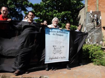Journalists demonstrate on Paraguayan Journalist Day beside a memorial commemorating Santiago Leguizamon in Asuncion