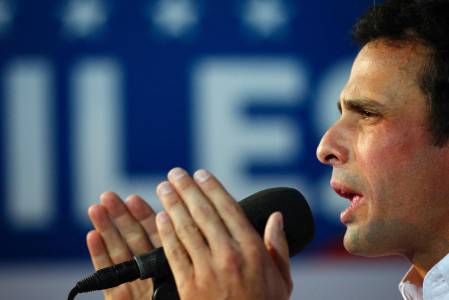 Venezuela's opposition leader Henrique Capriles talks to the media during a news conference in Caracas