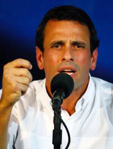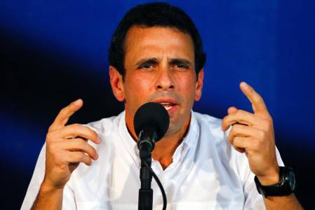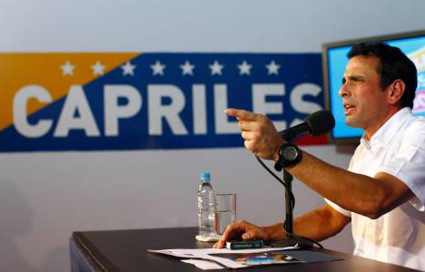 Venezuela's opposition leader Henrique Capriles talks to the media during a news conference in Caracas