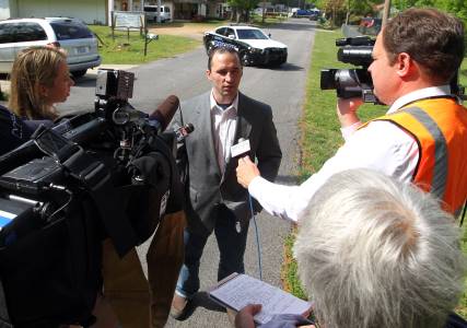 Everett Dutschke speaks to the media as federal officials search his property in Tupelo, Mississippi, April 23, 2013. Federal law enforcement agencies investigating ricin-laced letters sent to President Barack Obama and other officials broadened their search for clues on Wednesday by targeting the former business of a Mississippi martial arts instructor. Members of an anti-terrorist response team from the Mississippi National Guard wearing hazmat suits had already searched Dutschke's home on Tuesday, accompanied by agents from the FBI and the U.S. Capitol Police. Picture taken April 23, 2013. REUTERS/Lauren Wood/Daily Journal (UNITED STATES - Tags: CRIME LAW MEDIA) FOR EDITORIAL USE ONLY. NOT FOR SALE FOR MARKETING OR ADVERTISING CAMPAIGNS. NO ARCHIVES. NO SALES
