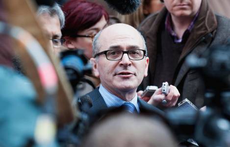 Federal prosecutor Richard Roy (R) speaks to media after the first court appearance of Chiheb Esseghaier in Montreal, April 23, 2013. Two men charged in Canada with plotting an attack on a passenger train will appear in court for bail hearings on Tuesday, while questions swirl about their background and reported links to al Qaeda elements in Iran. Esseghaier, 30, of Montreal and Raed Jaser, 35, were arrested and charged by Canadian police on Monday, sparking worries of a Canadian terror attack just one week after the Boston Marathon bombings killed three people and injured more than 200. REUTERS/Christinne Muschi (CANADA - Tags: CRIME LAW POLITICS CIVIL UNREST)
