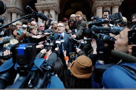 John Norris (C), the lawyer of suspect Raed Jaser, speaks to the media outside Old City Hall Court, following his client's brief appearance in court in Toronto April 23, 2013. Two men charged in Canada with plotting an attack on a passenger train will appear in court for bail hearings on Tuesday, while questions swirl about their background and reported links to al Qaeda elements in Iran. Chiheb Esseghaier, 30, of Montreal and Jaser, 35, were arrested and charged by Canadian police on Monday, sparking worries of a Canadian terror attack just one week after the Boston Marathon bombings killed three people and injured more than 200. REUTERS/Jon Blacker (CANADA - Tags: CIVIL UNREST CRIME LAW TPX IMAGES OF THE DAY)