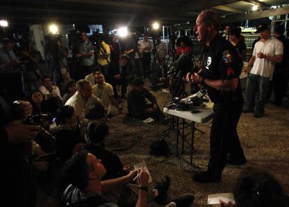 Waco Police spokesperson William Swanton speaks at a media conference regarding an explosion at a fertilizer plant in the town of West, near Waco